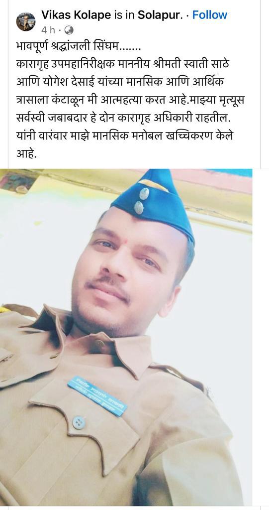 सोलापूर: सोलापूर जिल्हा कारागृहात शनिवारी सायंकाळी धक्कादायक घटना घडली. जेलमधील शिपाई विकास गंगाराम कोळपे (वय ३४, नेमणूक, सोलापूर जिल्हा कारागृह, रा. कारागृह वसाहत, सोलापूर) या कारागृह कर्मचाऱ्याने स्वतःवर तीन गोळ्या झाडून आत्महत्या करण्याचा प्रयत्न केला आहे. त्यांनी फेसबुकवर स्वतःचा फोटो आणि स्वतःलाच श्रद्धांजली अर्पण करून आत्महत्या करत असल्याची पोस्ट करून स्वतःवरच गोळ्या घालून घेतल्या. कारागृह कर्मचाऱ्याने फेसबुकवर स्वतःची जन्म तारीख आणि मृत्यू तारीख लिहून वरिष्ठ अधिकाऱ्यांच्या नावाचा उल्लेख करून आत्महत्या करत असल्याची धक्कादायक माहिती पोस्ट केली. कोळपे यांच्यावर रुग्णालयात अति दक्षता विभागात उपचार सुरू आहेत.