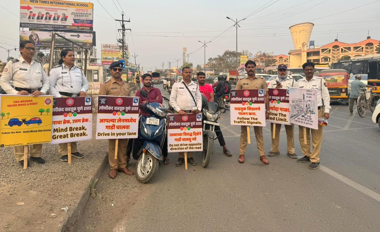 लोणीकंद वाहतूक विभागाचे सहा. पोलीस निरीक्षक गजाजन जाधव, पोलीस उपनिरीक्षक राहुल नळकांडे, पोह संदीप पाटील, बी एस खेडकर स्वप्नील गालफाडे, राजेंद्र माने, जान्वी लामखडे, सुनिता पौळ, बी टी राख, एस डी गिरे यांनी नियमांबाबत जनजागृती केली.