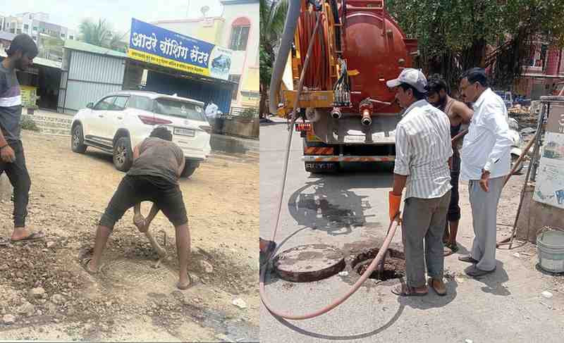 वाघोली-डोमखेल रोडवरील ऐश्वर्या लक्ष्मी सोसायटी, अनुसया पार्क परिसरातील काही दिवसांपासून ड्रेनेज तुंबले होते. भाजप युवा मोर्चा पुणे जिल्हाध्यक्ष संदीप सातव यांनी प्रत्यक्ष परिसराची पाहणी करून नागरिकांची समस्या मार्गी लावण्यासाठी तातडीने पुणे महापालिका अधिकाऱ्यांशी समन्वय साधला. त्यानंतर जेटिंग मशीनच्या मदतीने ड्रेनेज लाईन साफ करून तुंबलेली गटार व्यवस्था सुरळीत करण्यात आली.