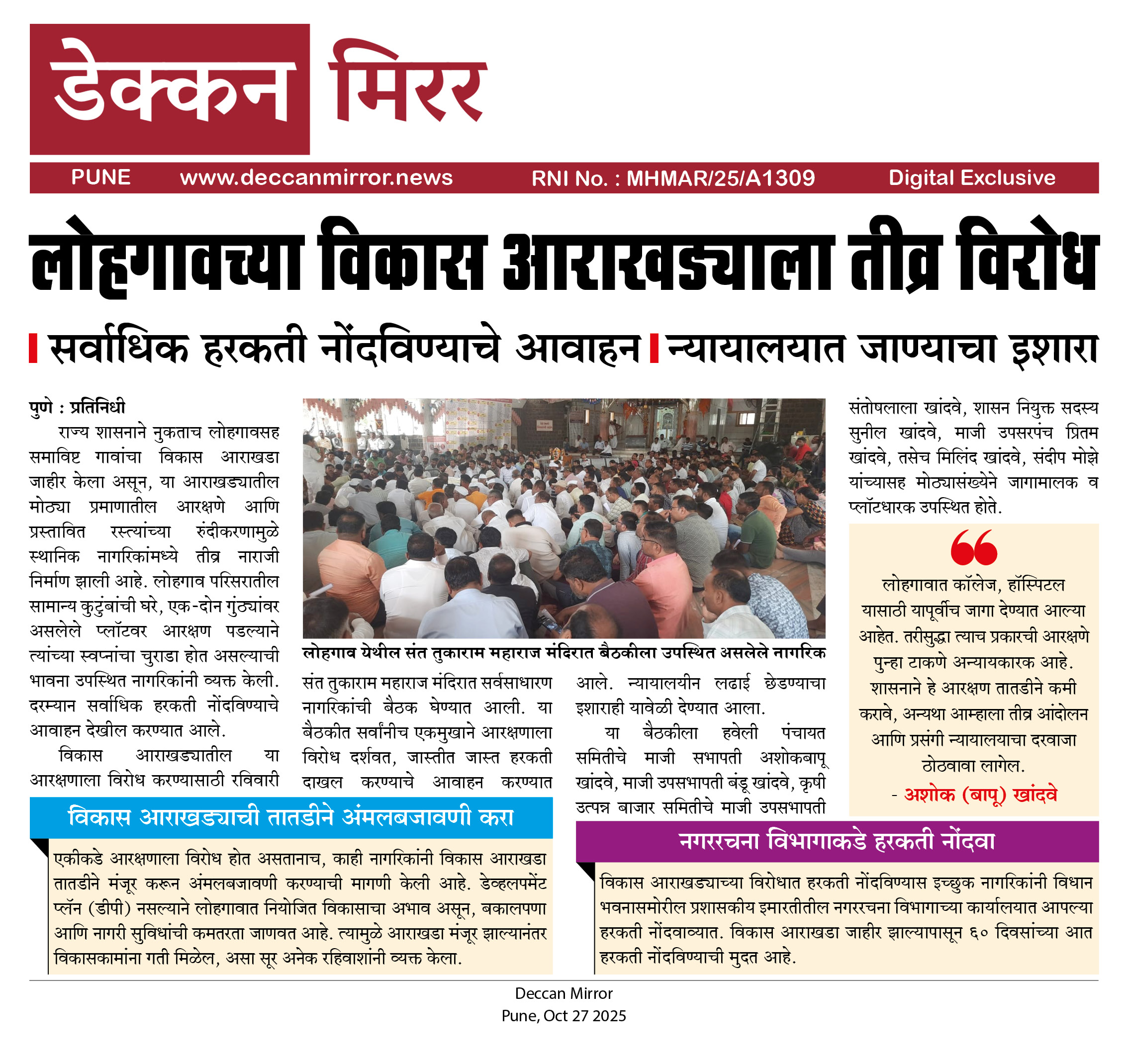 Home/Print Box/लोहगावच्या विकास आराखड्याला तीव्र विरोध | सर्वाधिक हरकती नोंदविण्याचे आवाहन | न्यायालयात जाण्याचा इशारा लोहगावच्या विकास आराखड्याला तीव्र विरोध | सर्वाधिक हरकती नोंदविण्याचे आवाहन | न्यायालयात जाण्याचा इशारा DM AdminDecember 1, 2025 101 Less than a minute Download JPG file DM AdminDecember 1, 2025 101 Less than a minute